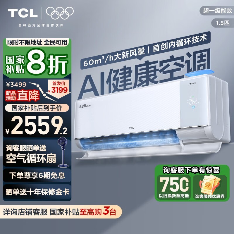 TCL 1.5匹小蓝翼Q7Max新风空调挂机大1匹一级变频