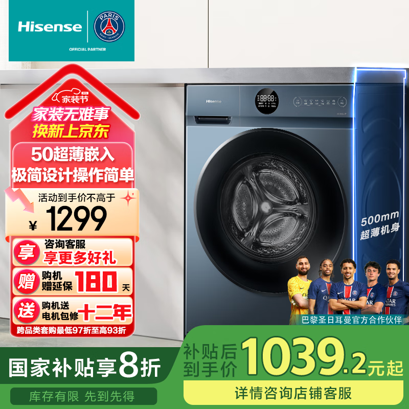 海信洗衣机HG100DJ12F高温蒸汽除螨10公斤大容量全自动滚筒