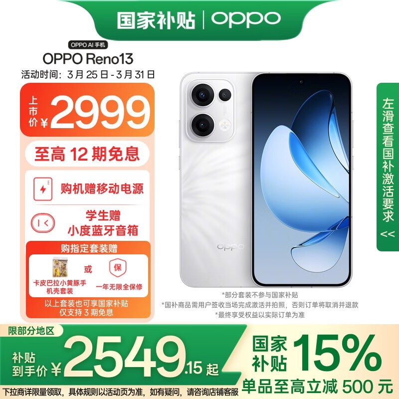 OPPO Reno13 5G手机心动白配色大存储空间时尚选择