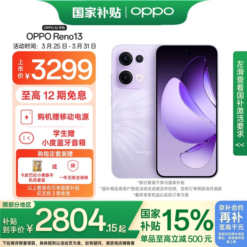 OPPO Reno13 5G蝶蝶紫手机,低至2649元