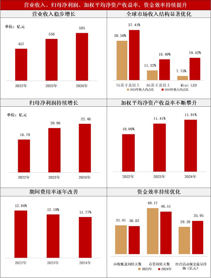 3月30日,海信视像科技股份有限公司发布2024年度度报告。公司“高端化、大屏化”战略的实施有效驱动了销售结构改善,研、产、销全流程数字化转型和智能化升级确保了运营效率的持续提升,经营业绩稳健增长,运营质量持续向好。报告期内,公司实现营业收入585.30亿元,同比增长9.17%;归属于上市公司股东的净利润22.46亿元,同比增长7.17%;加权平均净资产收益率11.91%,同比增加0.5个百分点;经营活动现金流量净额35.95亿元,同比增长22.79%。
