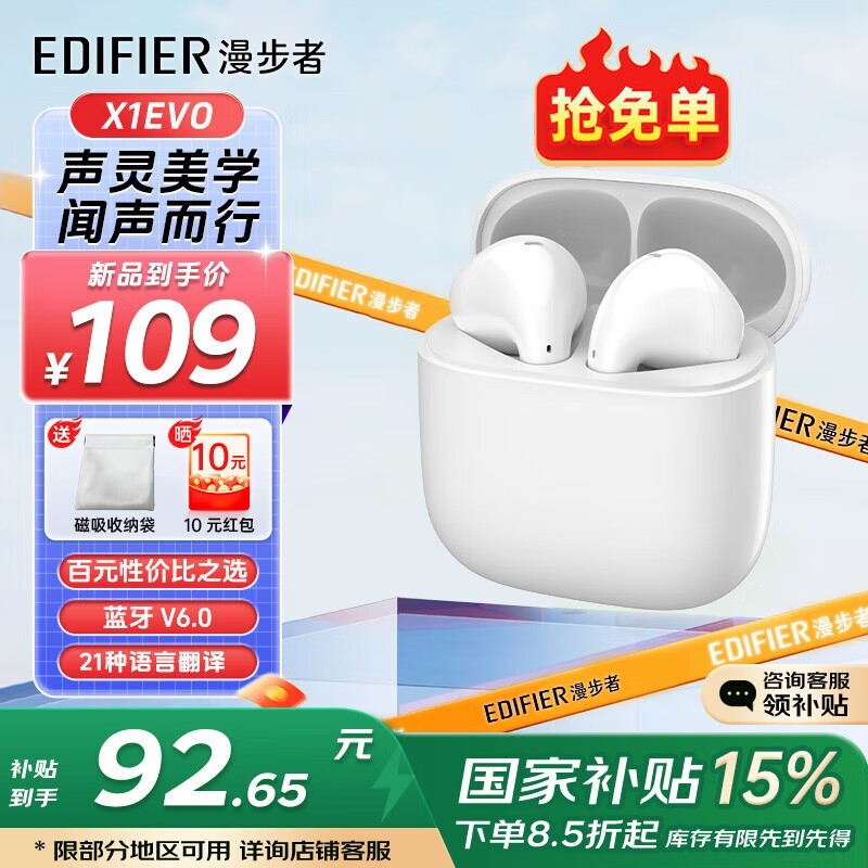 漫步者X1 Evo耳机京东优惠价82.65元