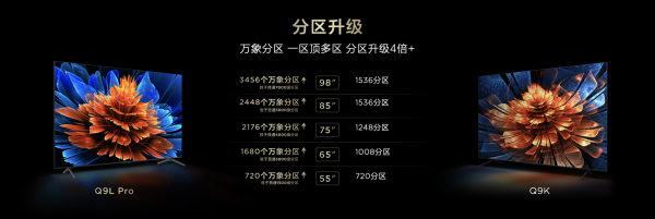 Q9L Pro全系共5个尺寸,分别为98/85/75/65/55吋,其中98吋新品零售价16999元,国补后只需14999元;85吋新品零售价9999元,国补后只需7999元;75吋新品零售价7499元,国补后只需5999元;65吋新品零售价5999元,国补后只需4799元;55吋新品零售价4299元,国补后只需3439元。Q9L全系3个尺寸,分别为85/75/65英寸,其中85吋新品零售价8999元,国补后只需7199元:75吋新品零售价6799元,国补后只需5439元:65吋新品零售价5499元,国补后只需4399元。
