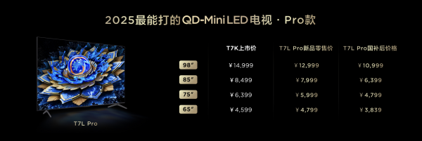 新品系列中尺寸最大、配置最高的Q9L Pro 98吋机型叠加国补后售价不超过15000元,价格最低的55吋 T7L国补后只有2799元,以这样的预算,就能买到屏幕和控光技术行业领先的主流产品,足以颠覆消费者对电视技术和产品品质的认知,质价比之王实至名归。