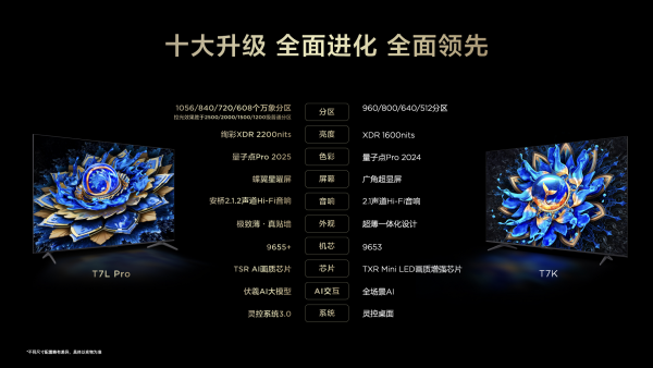 感受到网友们的热情,TCL也给出了积极回应。此次TCL两大系列Mini LED电视新品T7L、T7L Pro、Q9L和Q9L Pro正式揭开面纱,打造2025年最强QD-Mini LED新品阵容,在2025年的电视市场续写质价比传说,正式回复用户们一年的期待。
