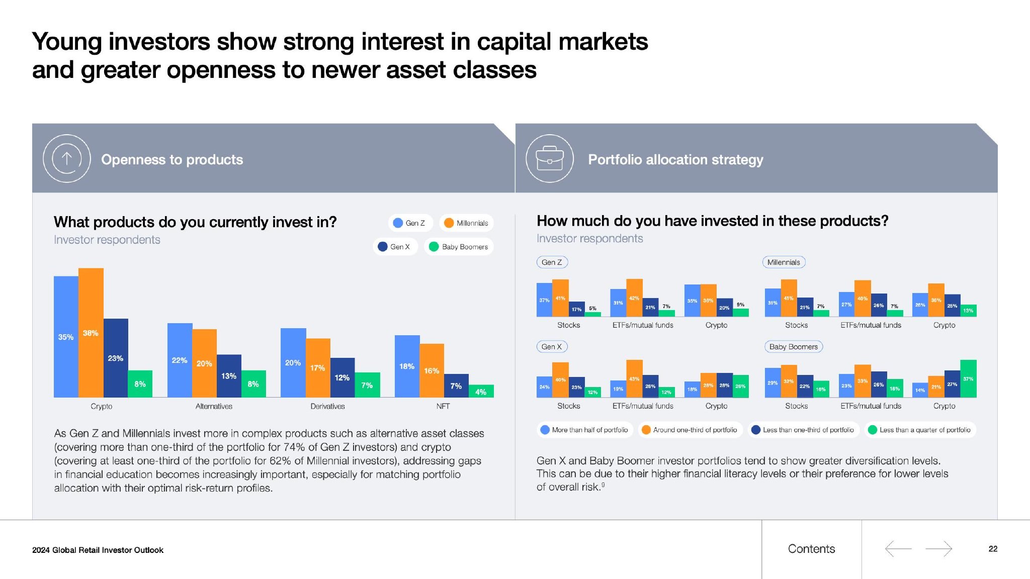 加密货币吸引力:44岁以下投资者中,超50%将至少1/3投资组合配置于加密货币;24%因不了解而回避加密货币(股票为29%)。