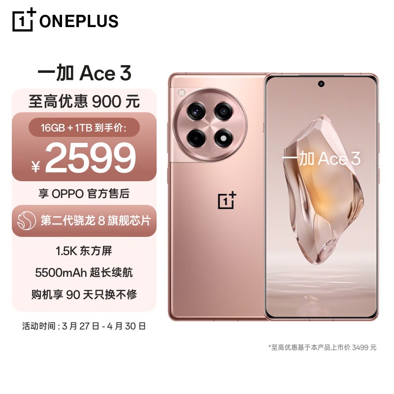 一加Ace3鸣沙金5G手机第二代骁龙8处理器1999元秒杀
