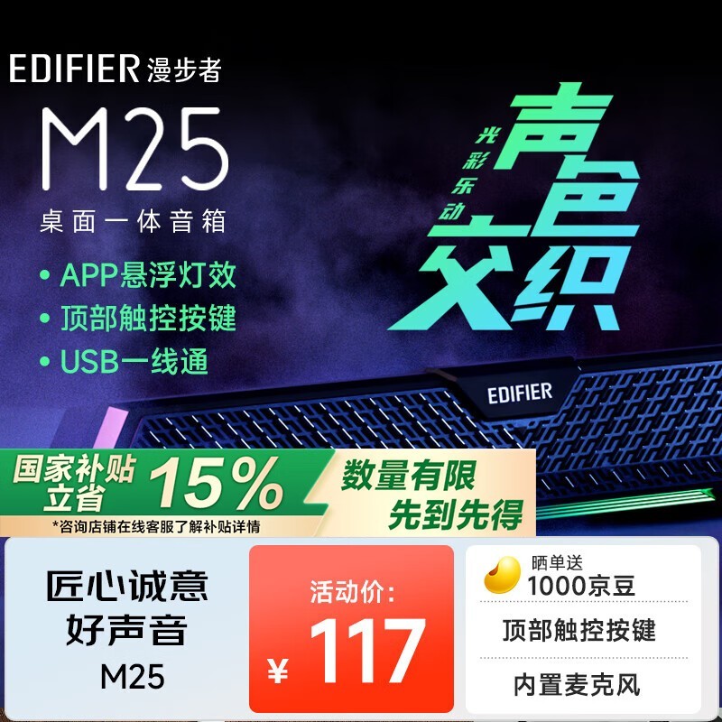 漫步者M25电脑音箱蓝牙5.3约1680万色灯效京东71.73元