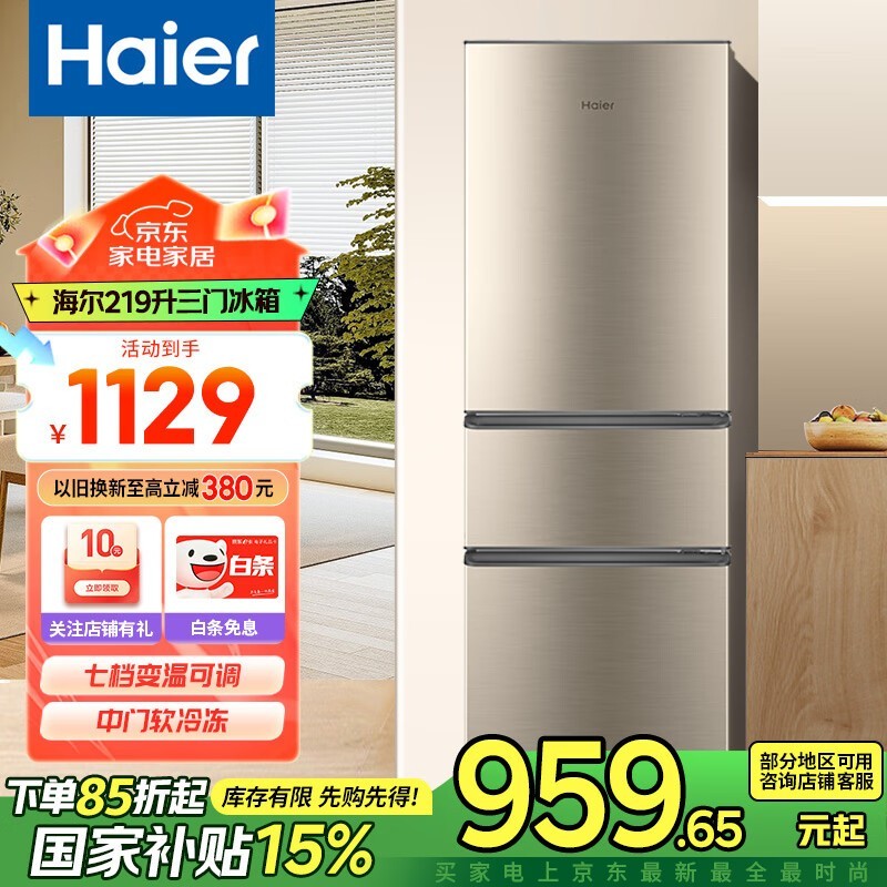 海尔小型双开门迷你冰箱219升三门三温区节能省电