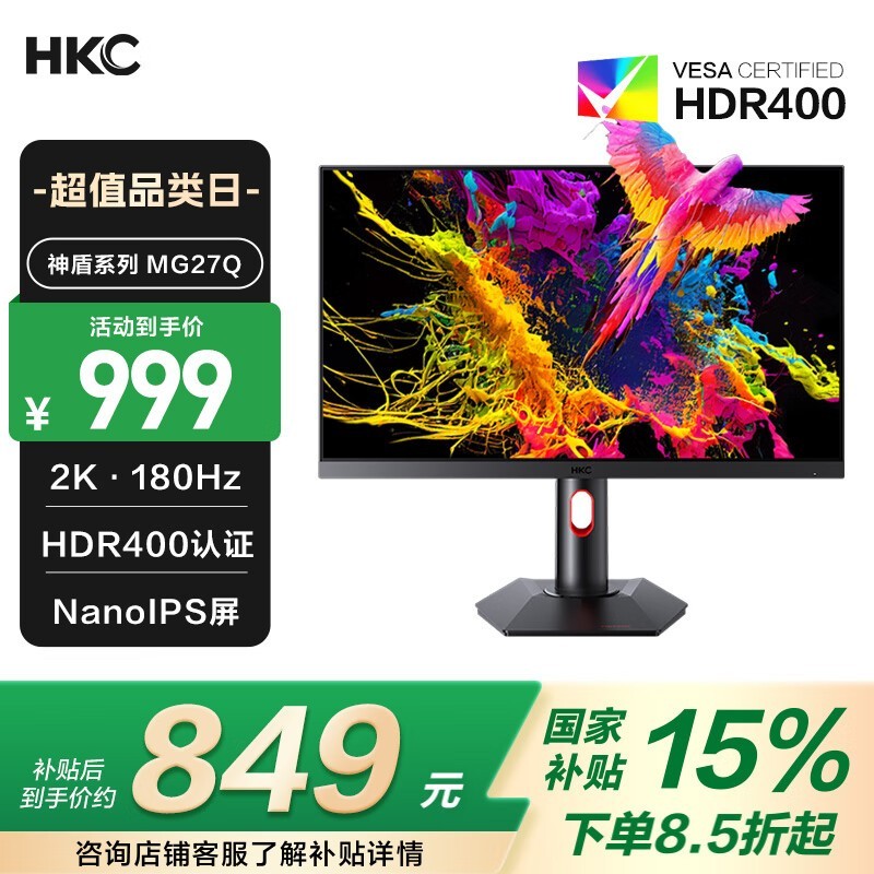 HKC神盾MG27Q 27英寸显示器促销,低至849元