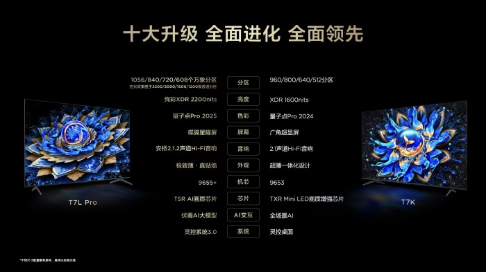 对比度是衡量Mini LED显示技术画质表现的核心指标,高对比度屏幕以及硬核控光技术均为提升对比度的有效手段。没有一块高对比度的屏幕,Mini LED技术就没有意义,因此,本次发布的TCL T7L Pro系列和Q9L Pro系列均采用了2024超旗舰级产品Q10K Pro同款屏幕——蝶翼星曜屏,7000:1的超高原生对比度,是普通IPS屏的5倍,配合0.5%LR低反膜及89°规则排布的液晶分子,实现了内外双低反,全屏反射率低至1.8%,大幅降低环境光干扰。而T7L Pro系列搭载至高1056个万象分区,控光效果高于传统电视2500个普通分区,Q9L Pro系列至高搭载3456个万象分区,控光效果更是上一代产品Q9K的4倍以上,使得画面对比度大幅提升,画质体验更上一层楼,可以说,没有万象分区技术,更多的普通分区数增加对画质的提升作用也不大。这次TCL全新推出的新品凭借着超强对比度,进一步提升了市场竞争力。