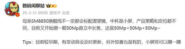 【CNMO科技消息】3月31日,有数码博主爆料称,小米16系列不一定都会标配潜望镜,中杯是小屏,产品策略和定位都不同,目前又开始测一颗50Mp直立中长焦,规格还是50Mp+50Mp+50Mp。