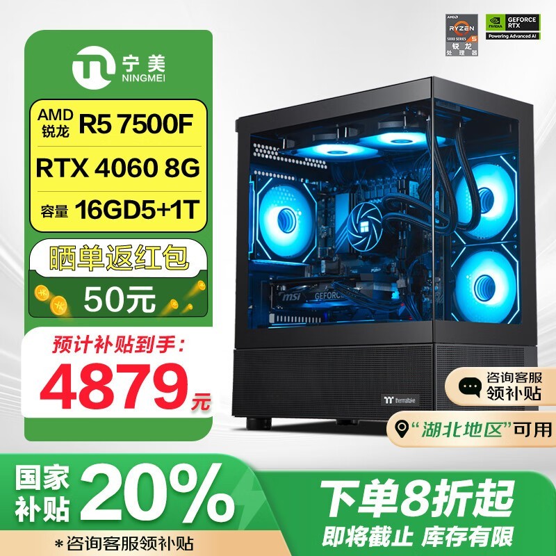 宁美AMD R5 7500F/RTX4060电竞游戏设计渲染主机
