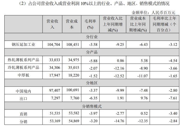 毛利率方面,2024年鞍钢股份占公司营业收入或营业利润10%以上的产品依次为热轧薄板系列产品、冷轧薄板系列产品、中厚板,对应毛利率分别为-5.88%、-2.07%、-1.52%,均为负值。