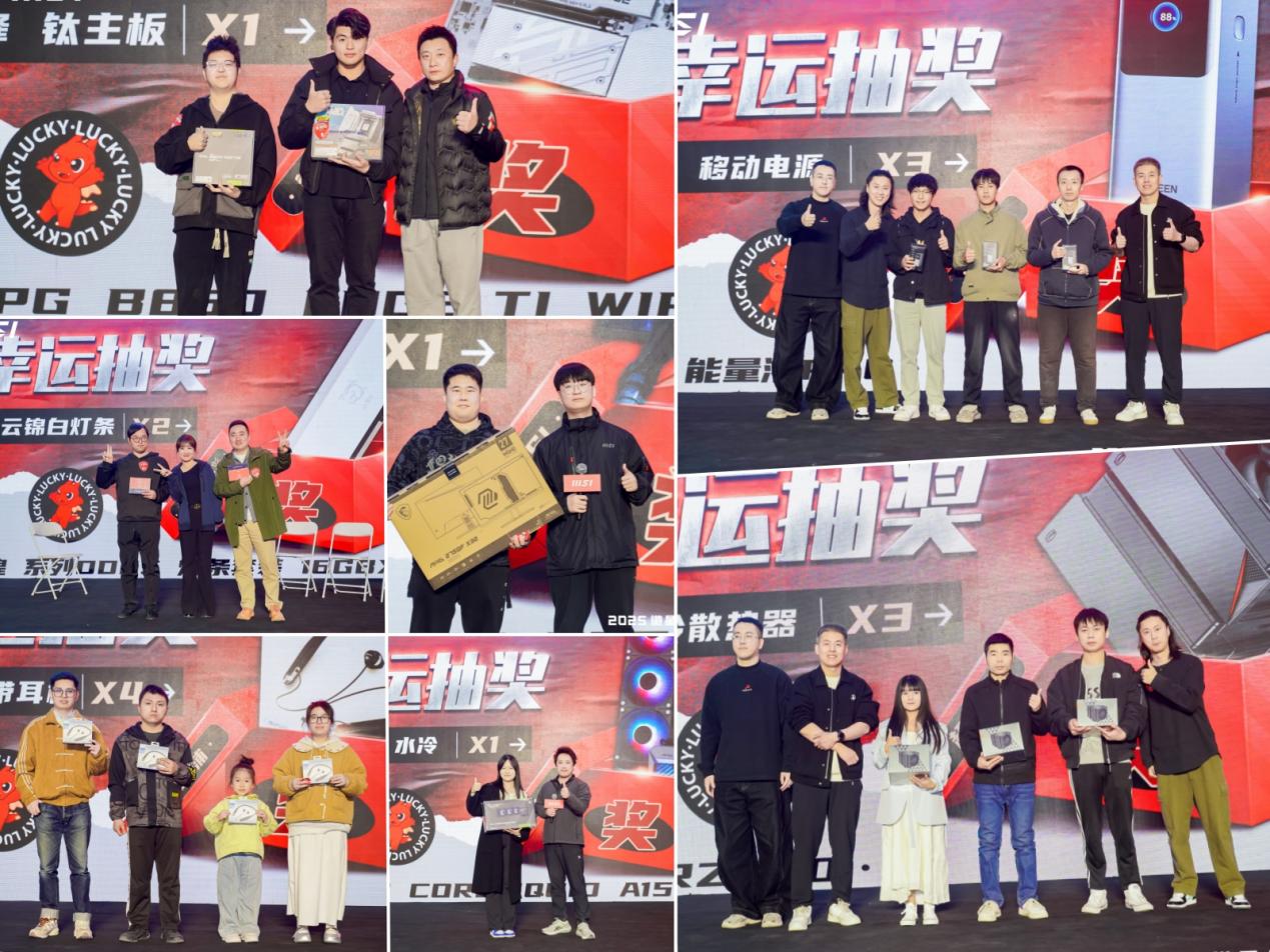 活动现场,微星特别设置了多轮抽奖环节,联合INTEL、AMD、闪迪、紫光国芯云彣、安德斯特、超频三、乔思伯、飞利浦、异极北极星、绿联等合作伙伴共同献上。所以奖品也是丰富多样,包括机箱、电源、水冷散热、显示器、无线网卡、键盘、电竞背包、内存等等。随着一轮轮抽奖的进行,现场气氛被推向了高潮。特别是终极大奖的抽取,微星市场部负责人张凯明先生亲自上台,为两位幸运观众送出了微星新品B860迫击炮主板及B850刀锋钛主板,让现场掌声雷动,欢呼声不断。在抽奖环节之余,微星还设置了电竞比赛环节。参赛选手们激烈对决,展现了高超的游戏技巧。胜利者不仅获得了微星周边礼品,更收获了现场观众的热烈掌声。也让观众在紧张刺激的比赛氛围中感受到了微星的电竞魅力。
