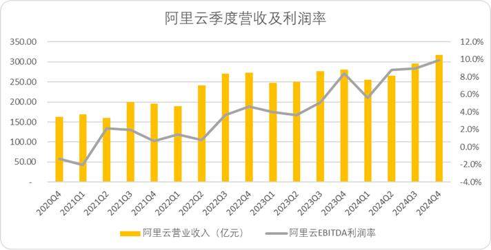 同时,在利润侧,直到2023年以前,阿里云的EBITDA利润率挣扎在低个位数的盈亏平衡线上,但2024年增长明显,Q4更是接近了两位数的区间。