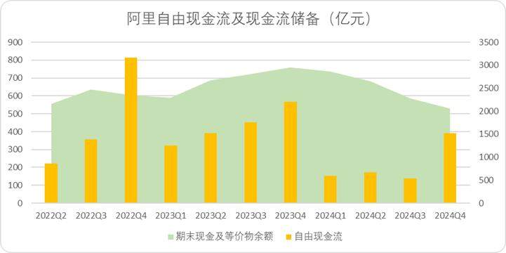 就在年报期,阿里公布了资本开支的计划,也与去年四季度资本开支的动向契合,未来三年将投入3800亿用于AI和基础设施建设,过去三年阿里自由现金累计3819亿。