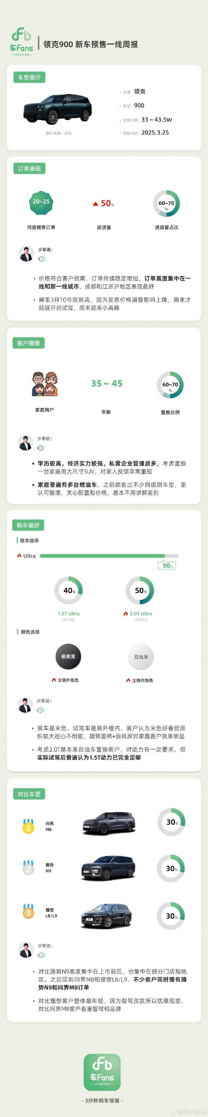 竞品对比方面,领克900面临10个竞品,其中与问界M8对比3次,与腾势N9对比3次,与理想L8/L9对比3次。对比腾势N9的情况高度集中在上市前后,且集中在部分门店和地区,之后客户关注点回到问界M8和理想L8/L9,不少客户同时握有腾势N9和问界M8订单。对比理想L8/L9的客户整体最年轻,因智驾改款而犹豫观望;对比问界M8的客户则更看重智驾和品牌。