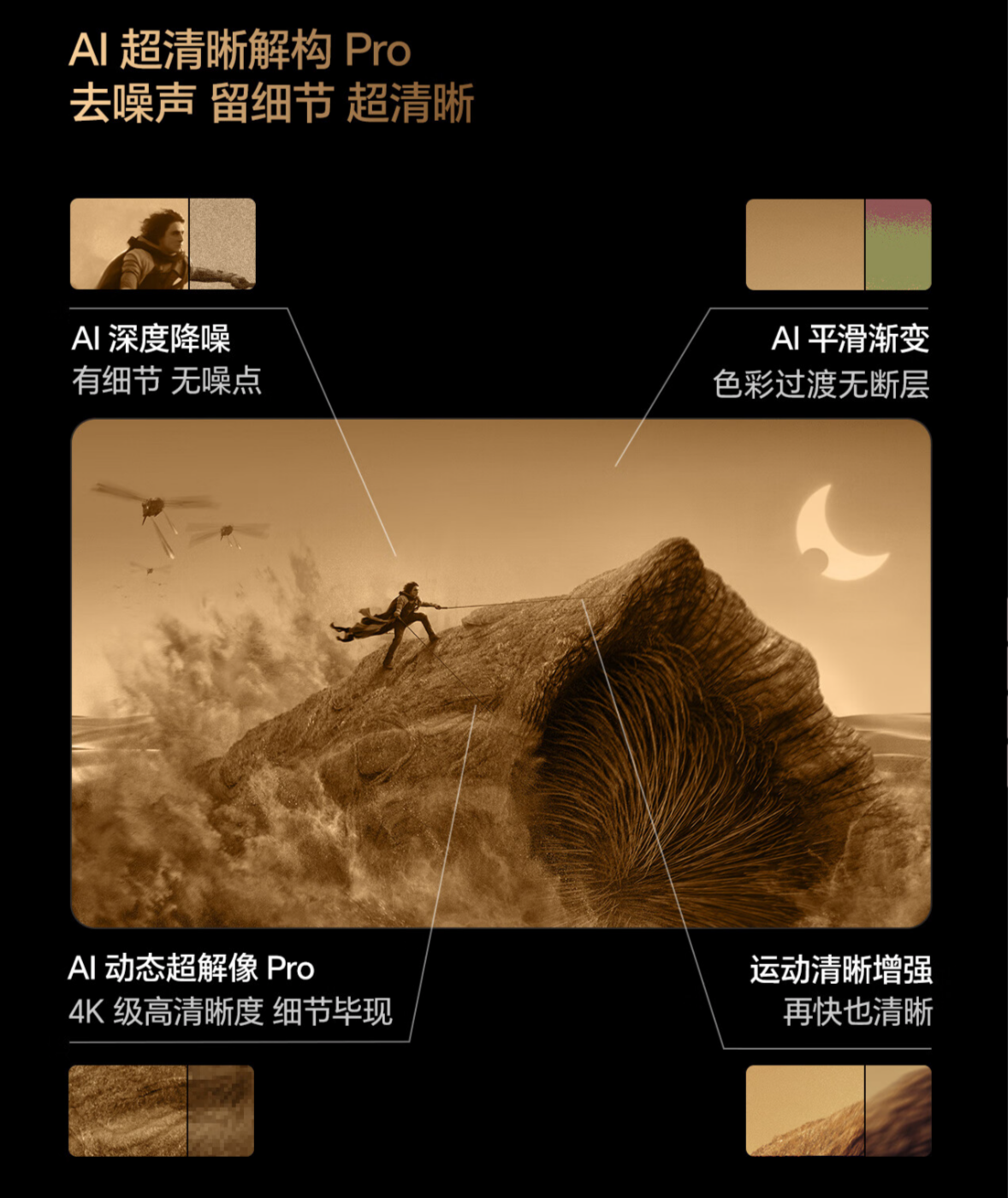 而AI超清晰解构Pro技术则能智能提升低分辨率片源质量,让优酷、爱奇艺、腾讯视屏等在线视频也能接近4K质感。