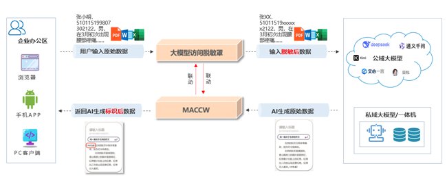 MACCW采用旁路方式接入用户网络,通过与大模型访问脱敏罩结合,实现用户与大模型之间数据上传、数据生成、数据防护的全方位安全保障,如下图所示: