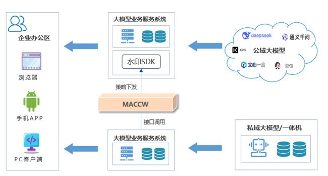 大模型业务服务系统部署安装MACCW的水印SDK或调用MACCW的API接口,当业务系统从公域大模型、私域大模型/一体机获取生成合成内容后,通过MACCW生成内容进行自动标识。