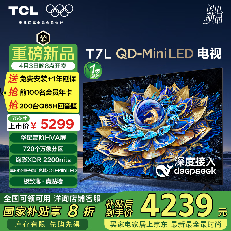 TCL 75T7L液晶电视,优惠后到手价4142元