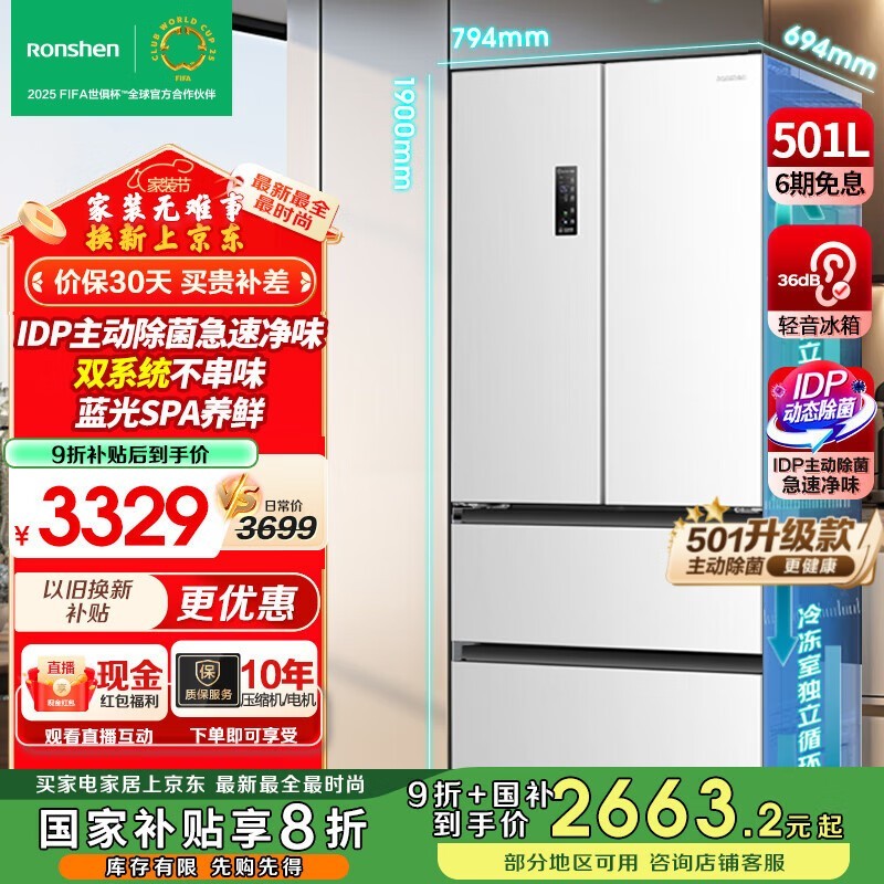 容声501Pro法式四开门冰箱,变频超薄静音设计,京东优惠价2481元