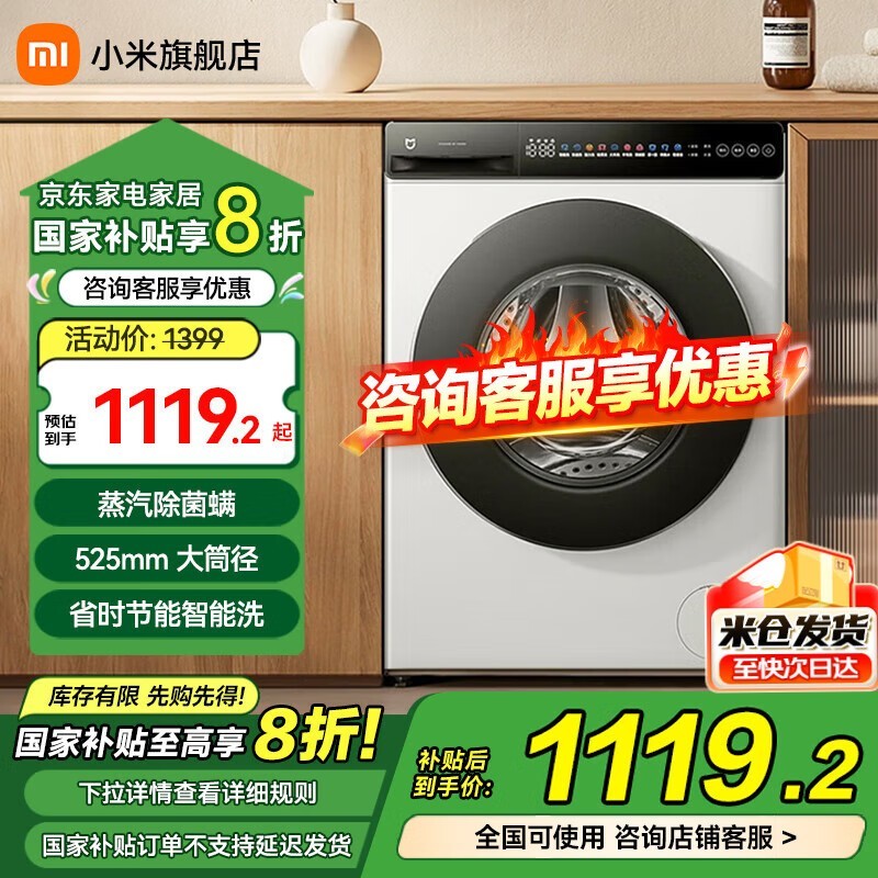 米家10公斤滚筒洗衣机超薄全嵌设计促销到手1079元