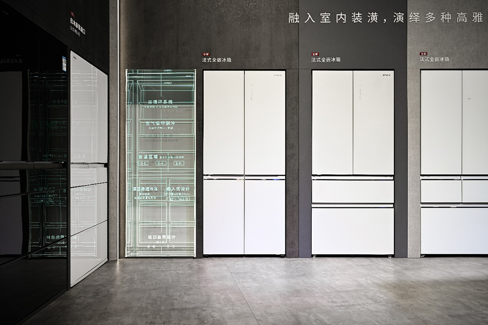 即将上市的新品嵌入式冰箱也在展会上亮相,包括新款十字四门、法式四门及五门冰箱。新品冰箱的奥妙就在于599MM的深度设计能与橱柜齐平;0.4CM无缝贴合技术,减少冰箱与柜体间的空隙,让家居空间更加和谐统一。同时,新品嵌入式冰箱采用90°大开门设计与底部散热系统,冰箱在有限空间内也能轻松使用并保持高效运行。