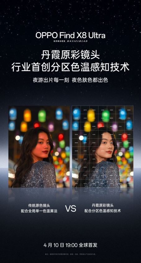 作为系列中的影像旗舰,OPPO Find X8 Ultra以“夜游出片,夜色肤色都出色”为核心卖点,搭载行业首创的丹霞原彩镜头与一英寸超光影五摄影像系统,联合哈苏共同研发,致力于解决复杂光源下的人像拍摄难题。