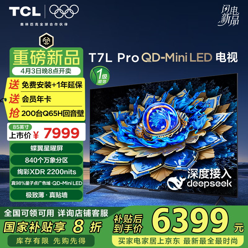 TCL 85T7L Pro液晶电视京东首发优惠价6399元