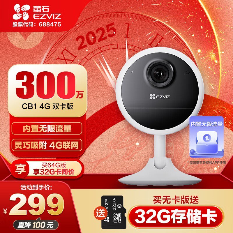 萤石CB1 4G电池智能摄像头优惠,低至208元