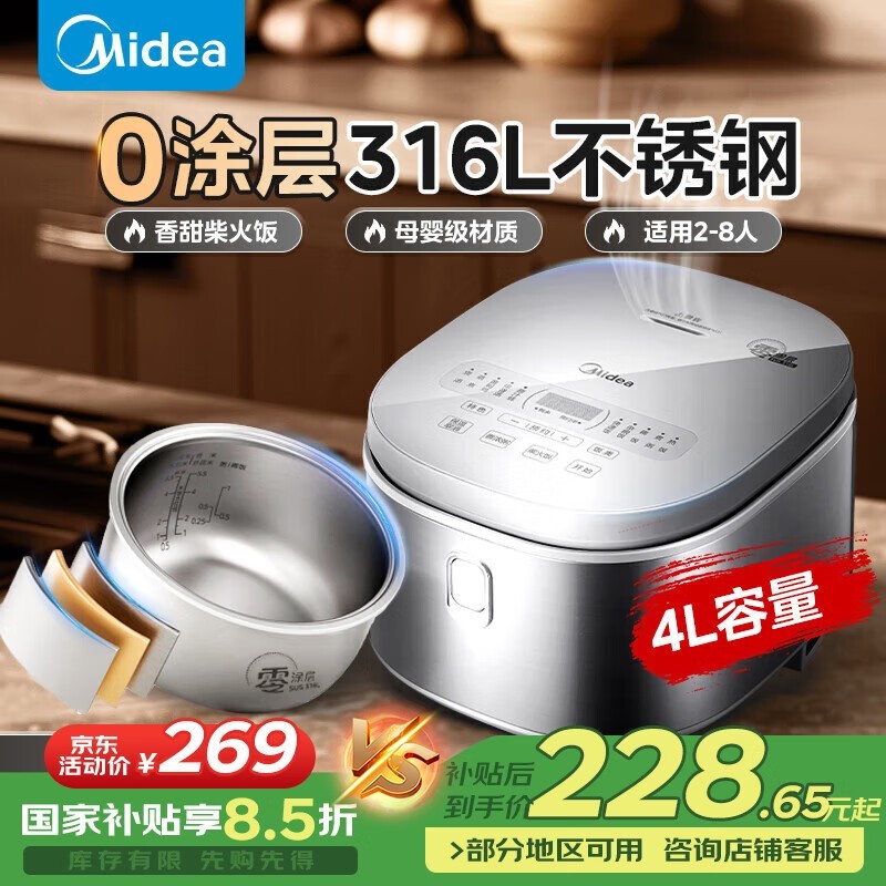 美的电饭煲RE476S创新无涂层技术4L大容量不锈钢内胆