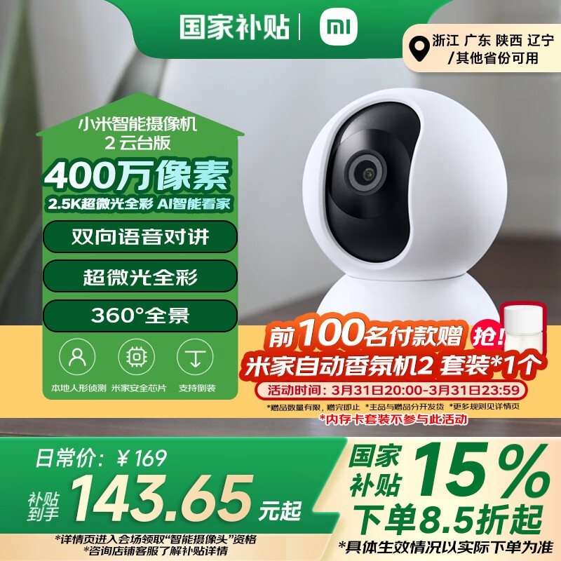 小米Xiaomi智能摄像机2云台版400万像素高清监控