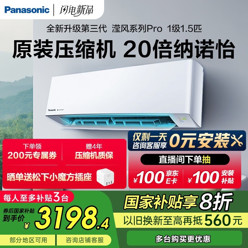 松下1匹滢风pro空调 京东自营到手3144元