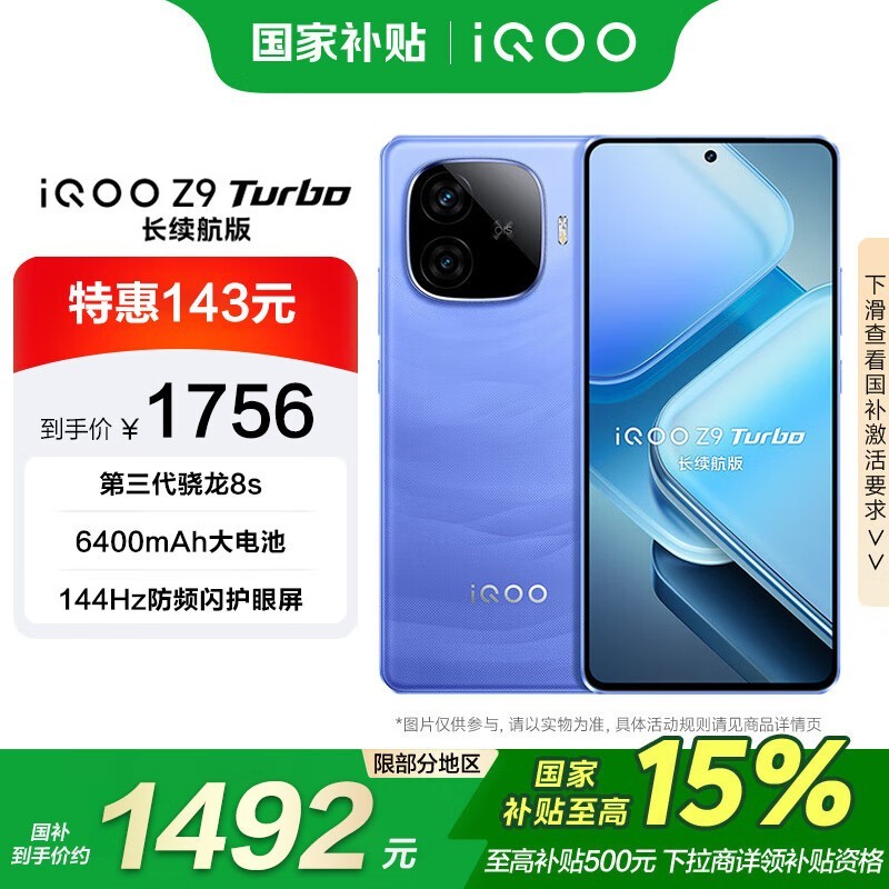 iQOO Z9 Turbo长续航版12GB+256GB京东国补价1492元