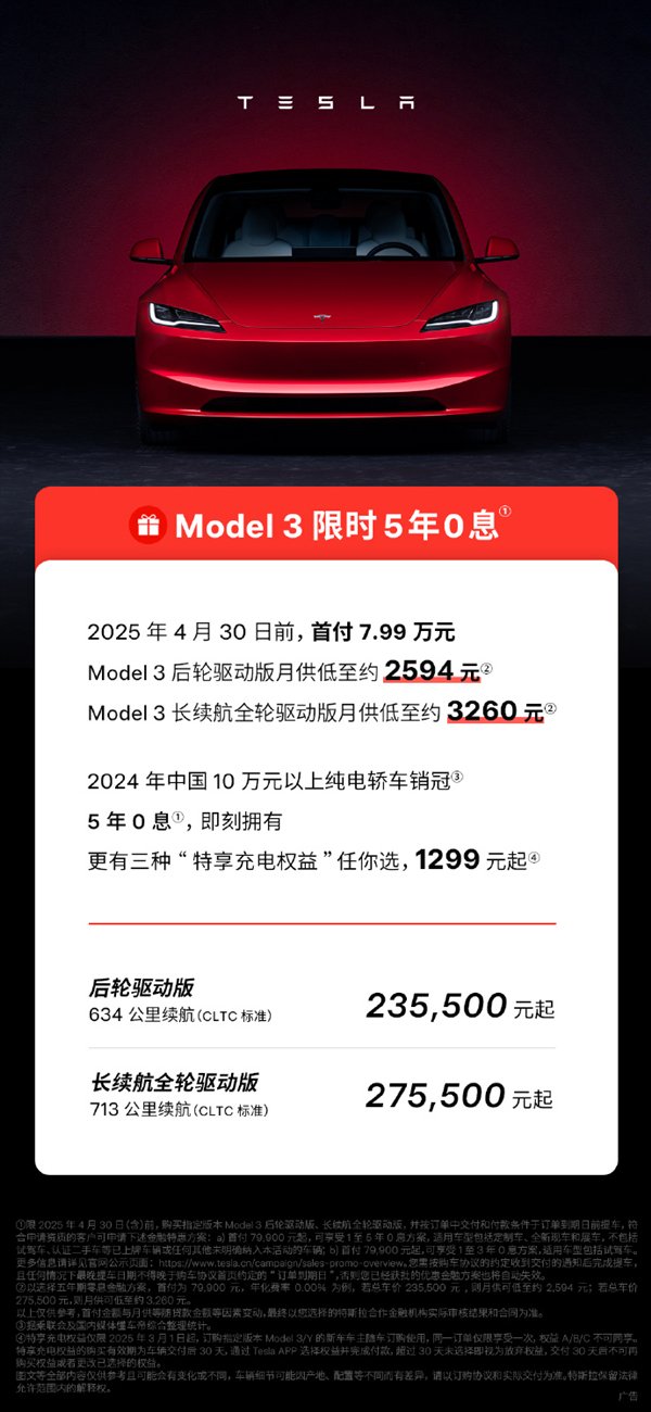 同时,特斯拉Model 3后轮驱动版/长续航全轮驱动版推出限时5年0息政策,月供低至2594元。