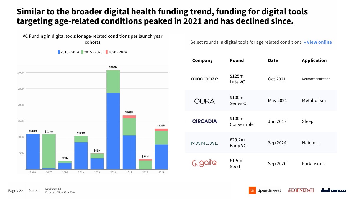 与更广泛的数字卫生融资趋势类似,针对年龄相关疾病的数字工具获得的投资在2021年达到顶峰,此后有所下降。