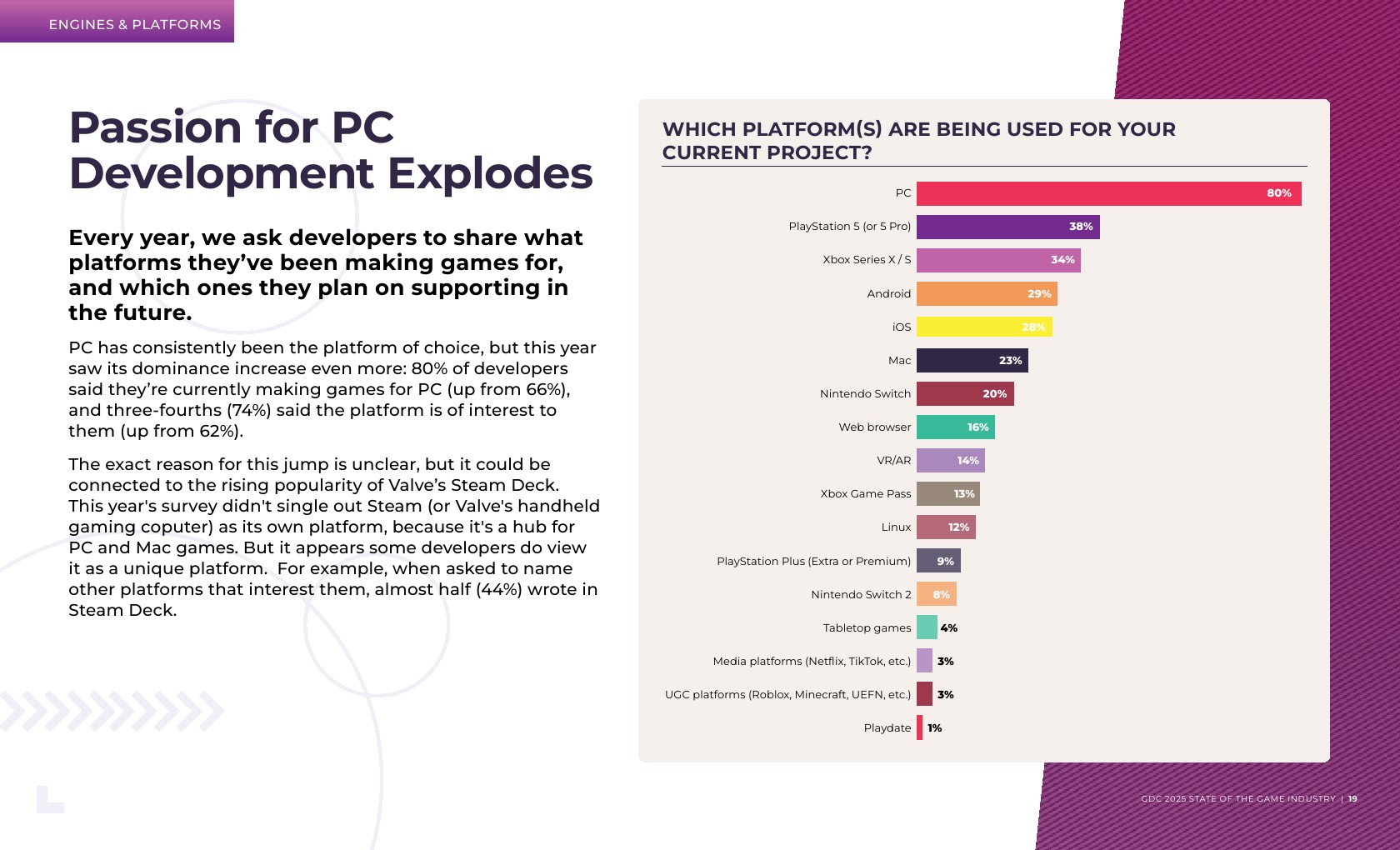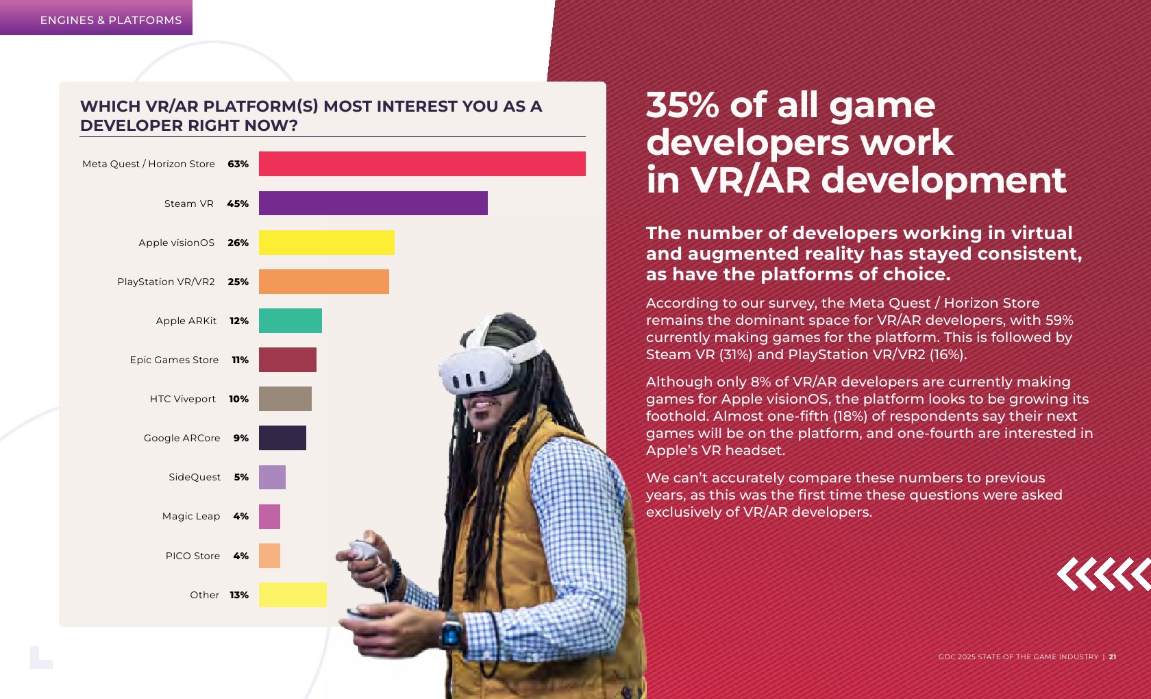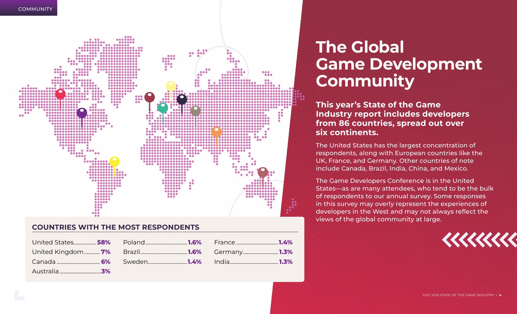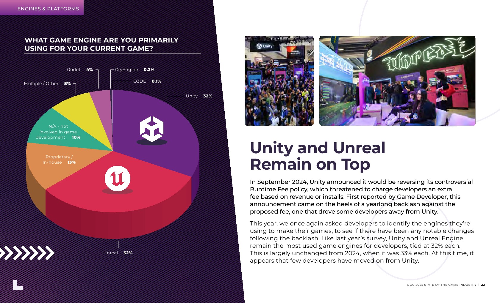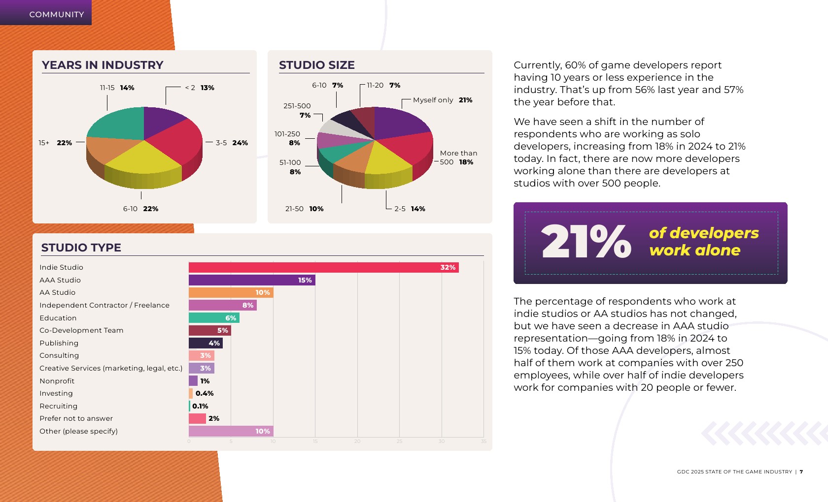 大多数受访者(59%)是独立开发者或在主要开发游戏的工作室工作。在职位角色方面,新开发者更有可能从事游戏设计,而经验丰富的开发者则倾向于制作和团队管理。