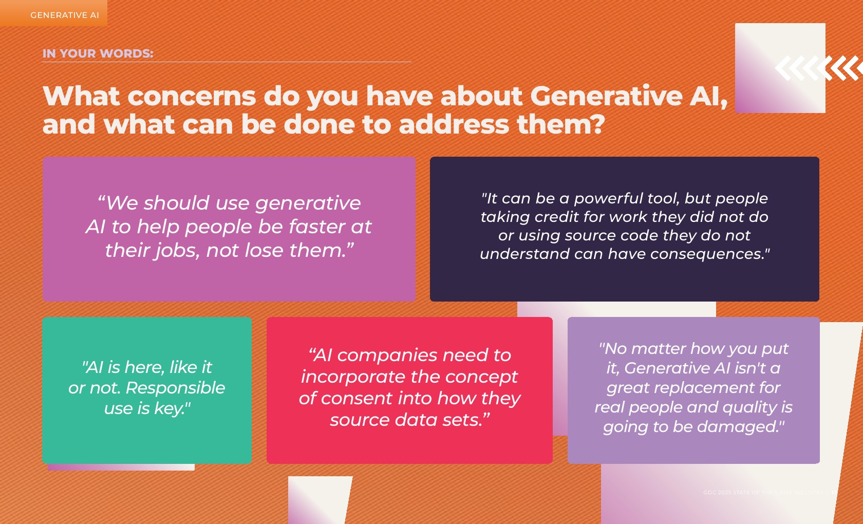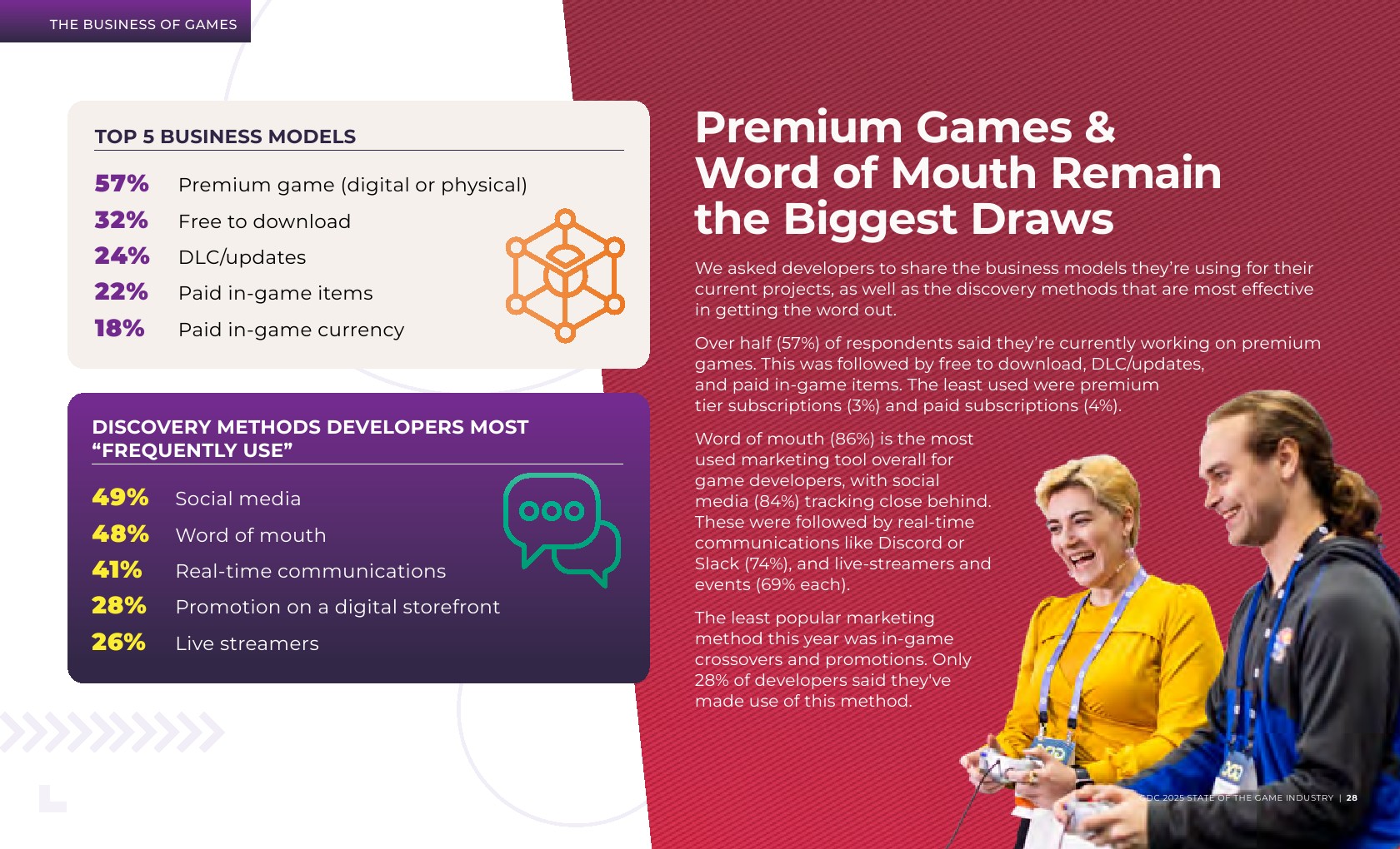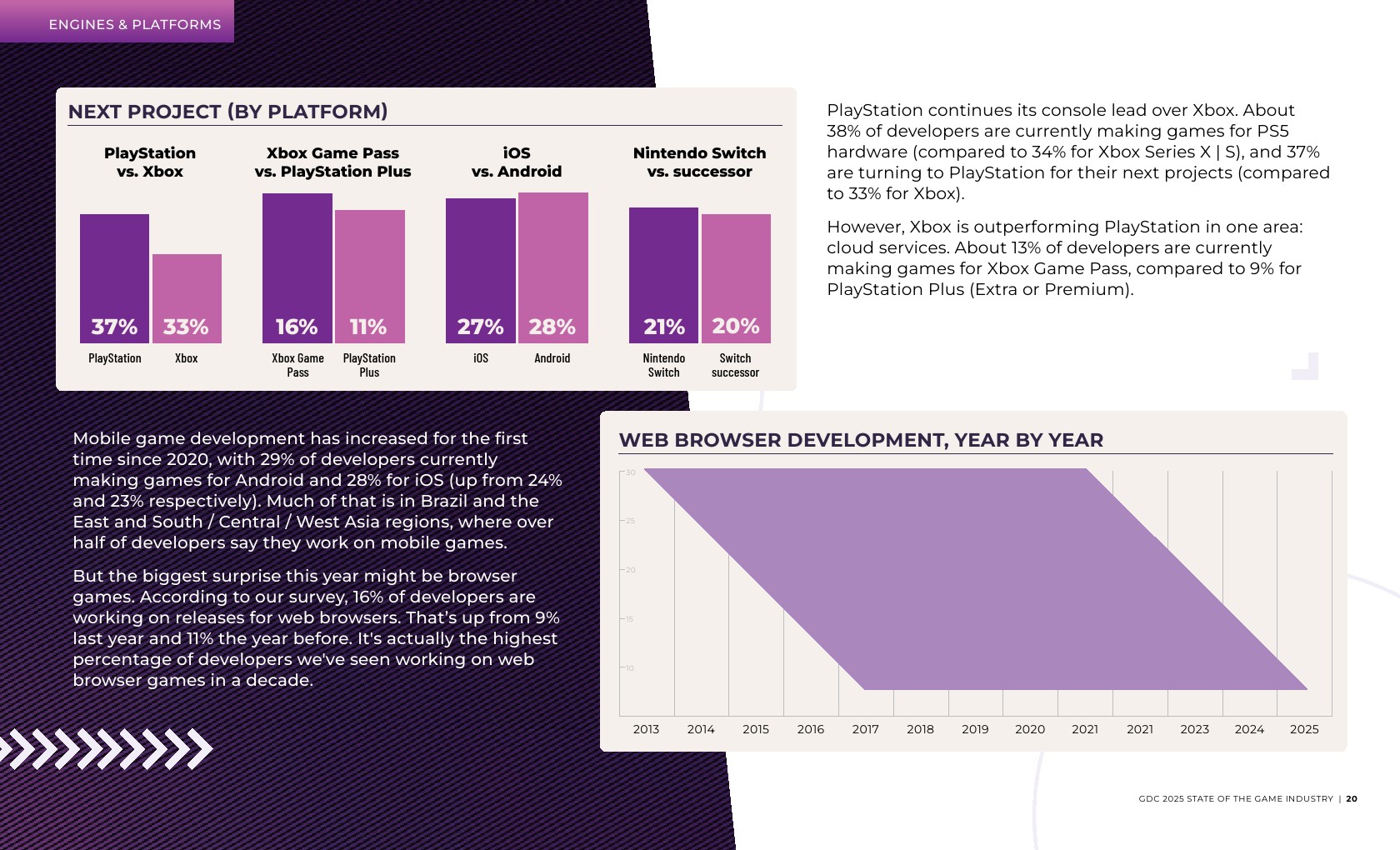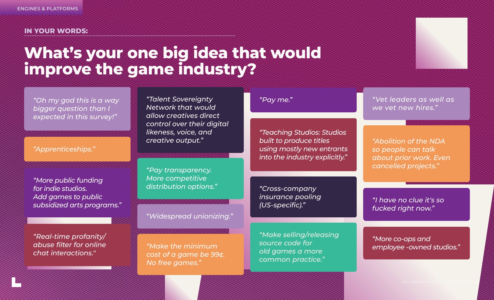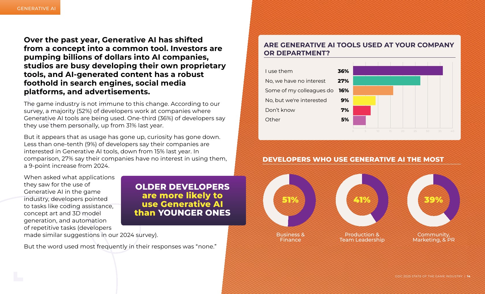 大多数受访者(59%)是独立开发者或在主要开发游戏的工作室工作。在职位角色方面,新开发者更有可能从事游戏设计,而经验丰富的开发者则倾向于制作和团队管理。