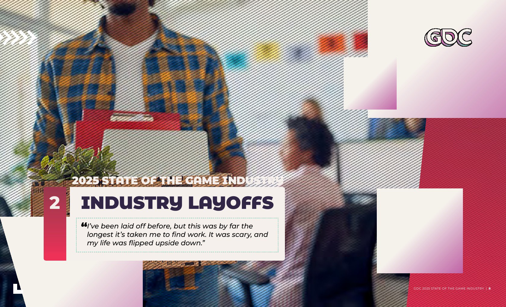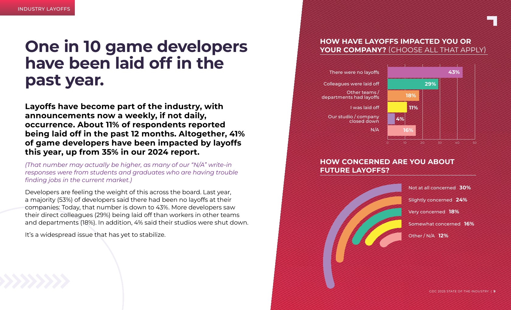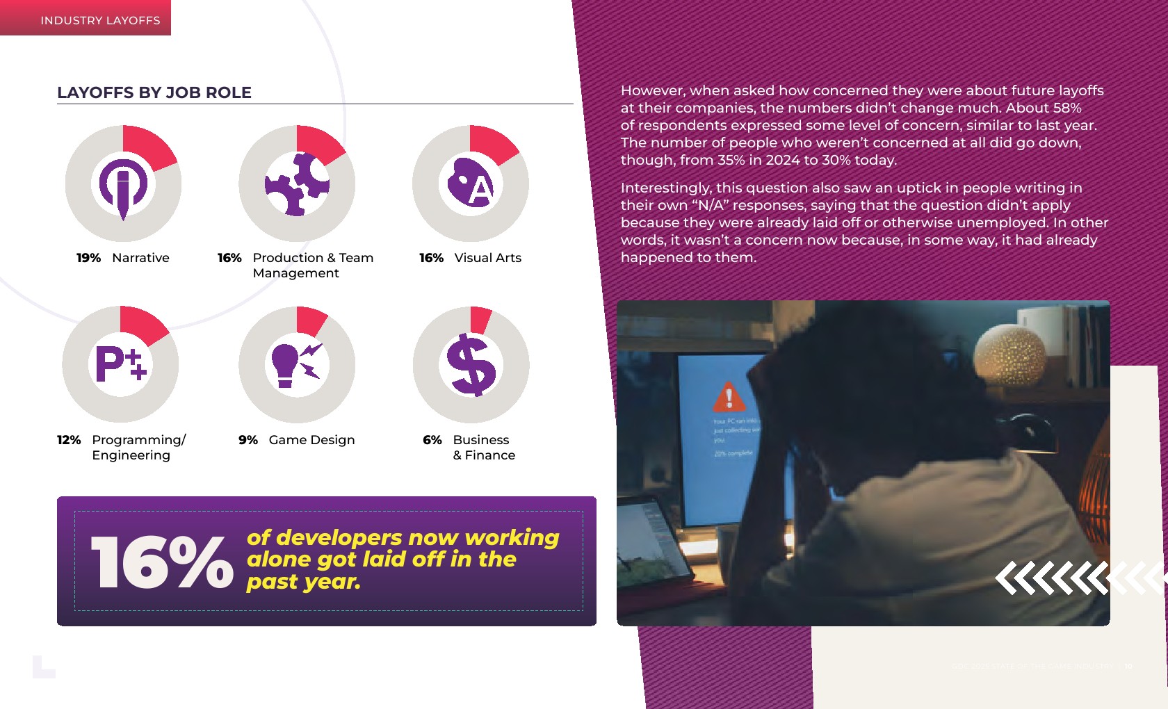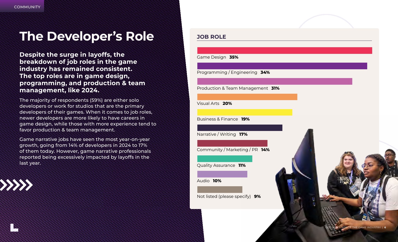 游戏叙事职位的年增长最为显著,从2024年的14%增长到现在的17%。游戏叙事专业人士报告称,他们在过去一年中受到了裁员的严重影响。