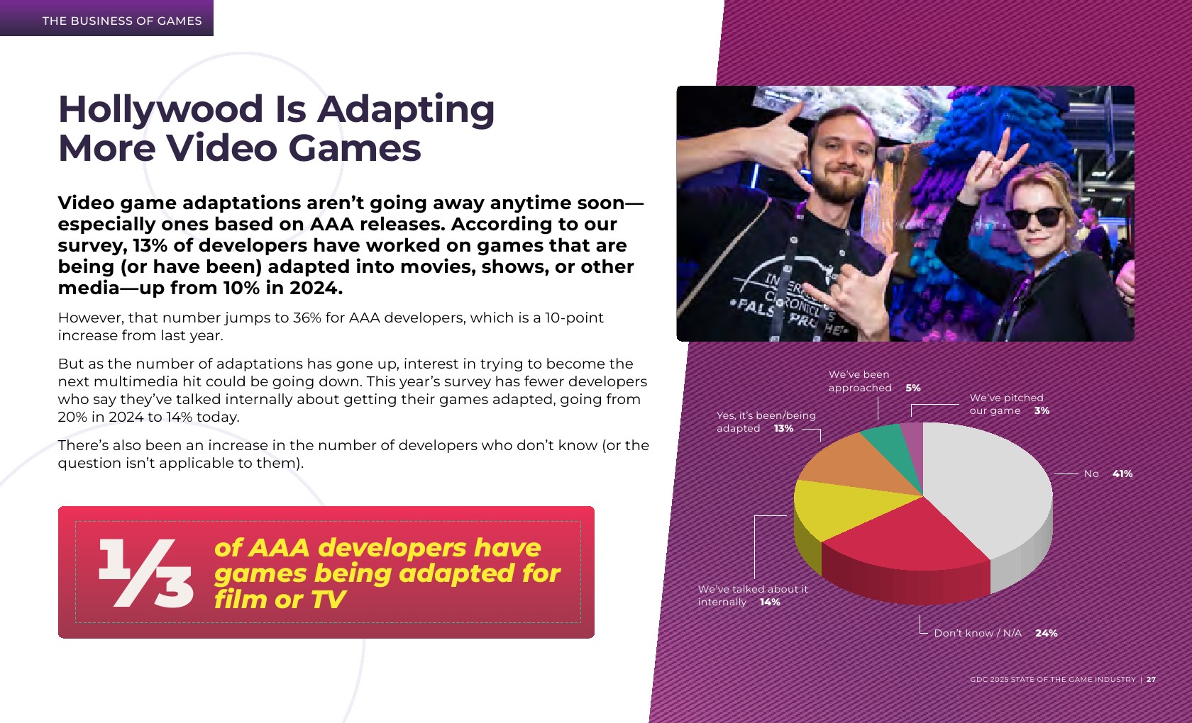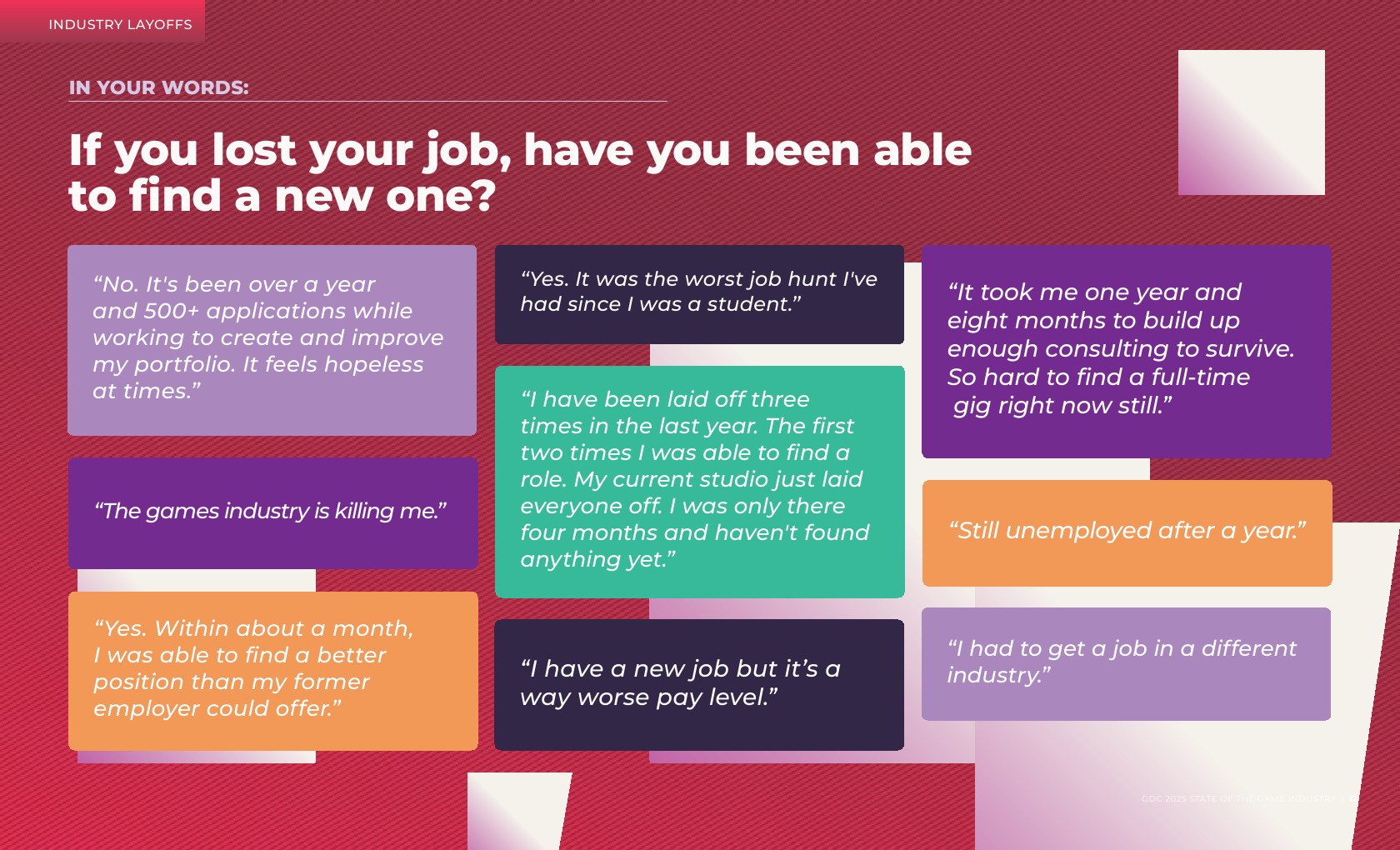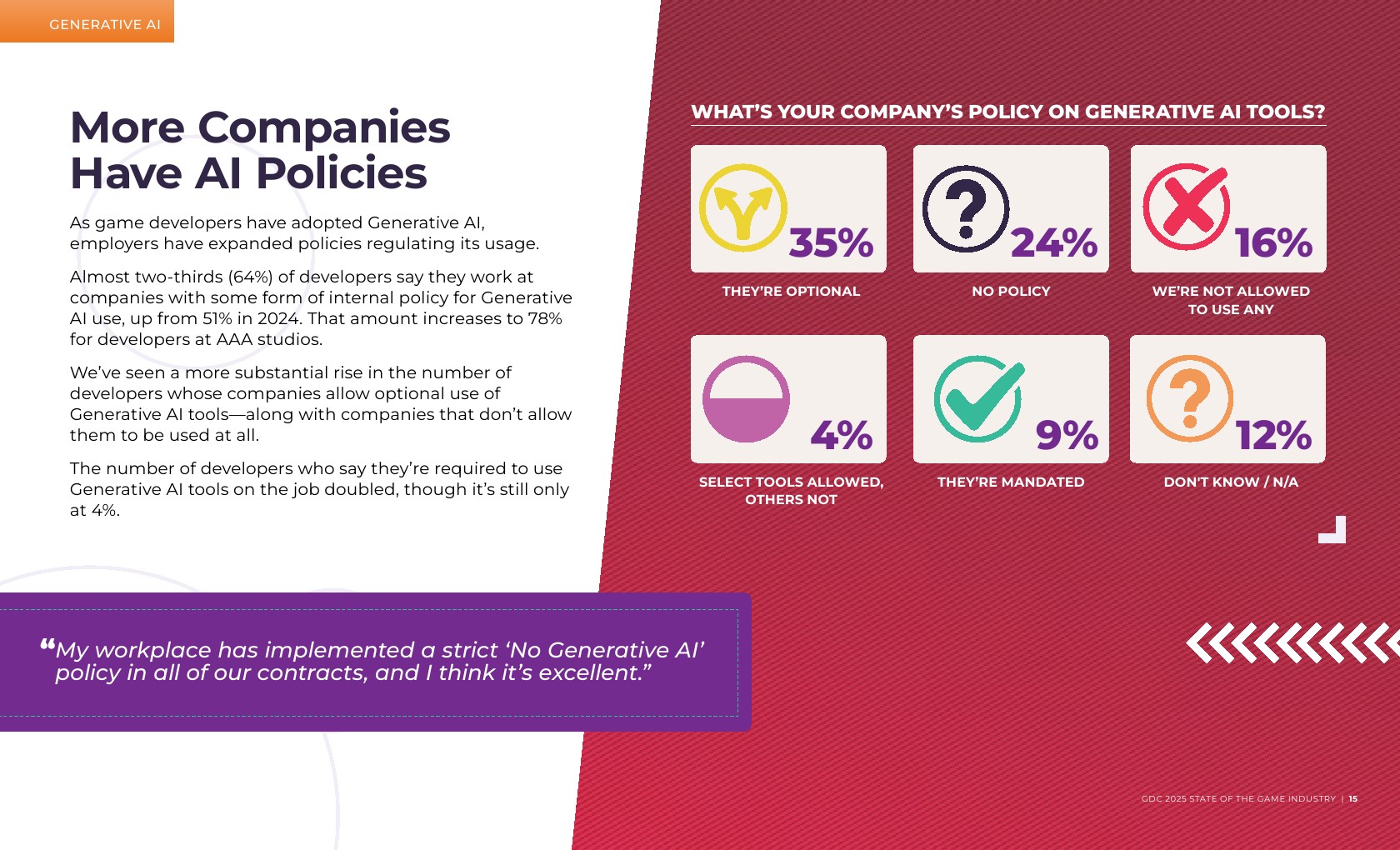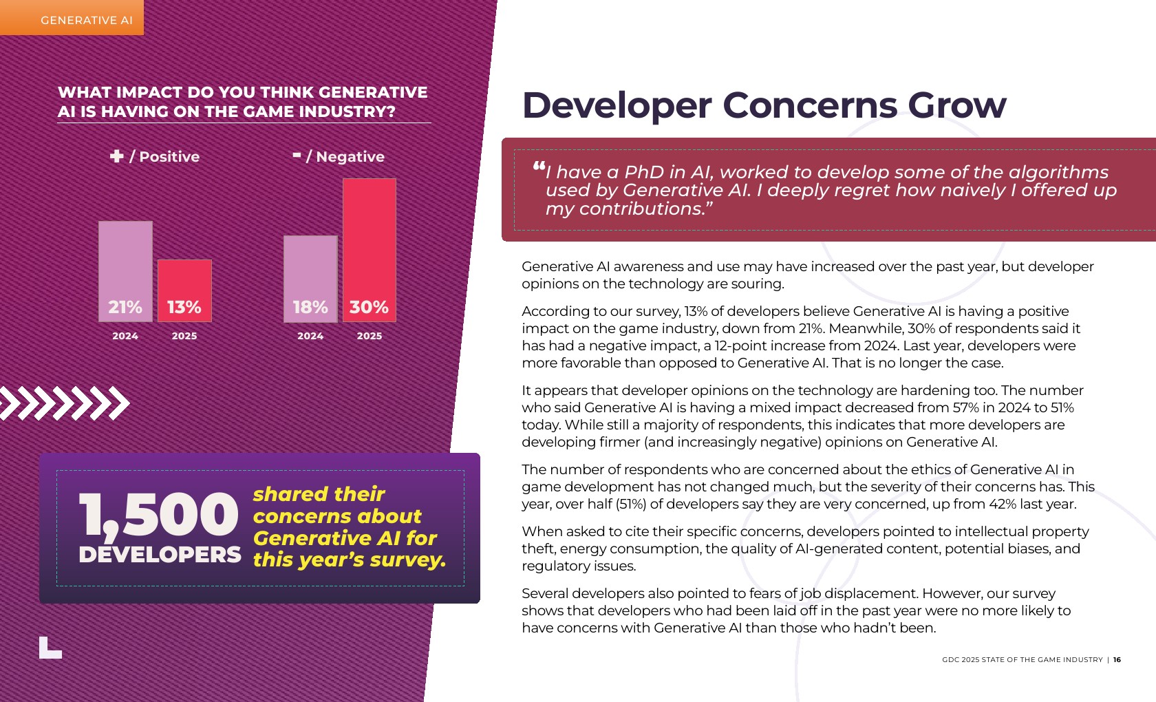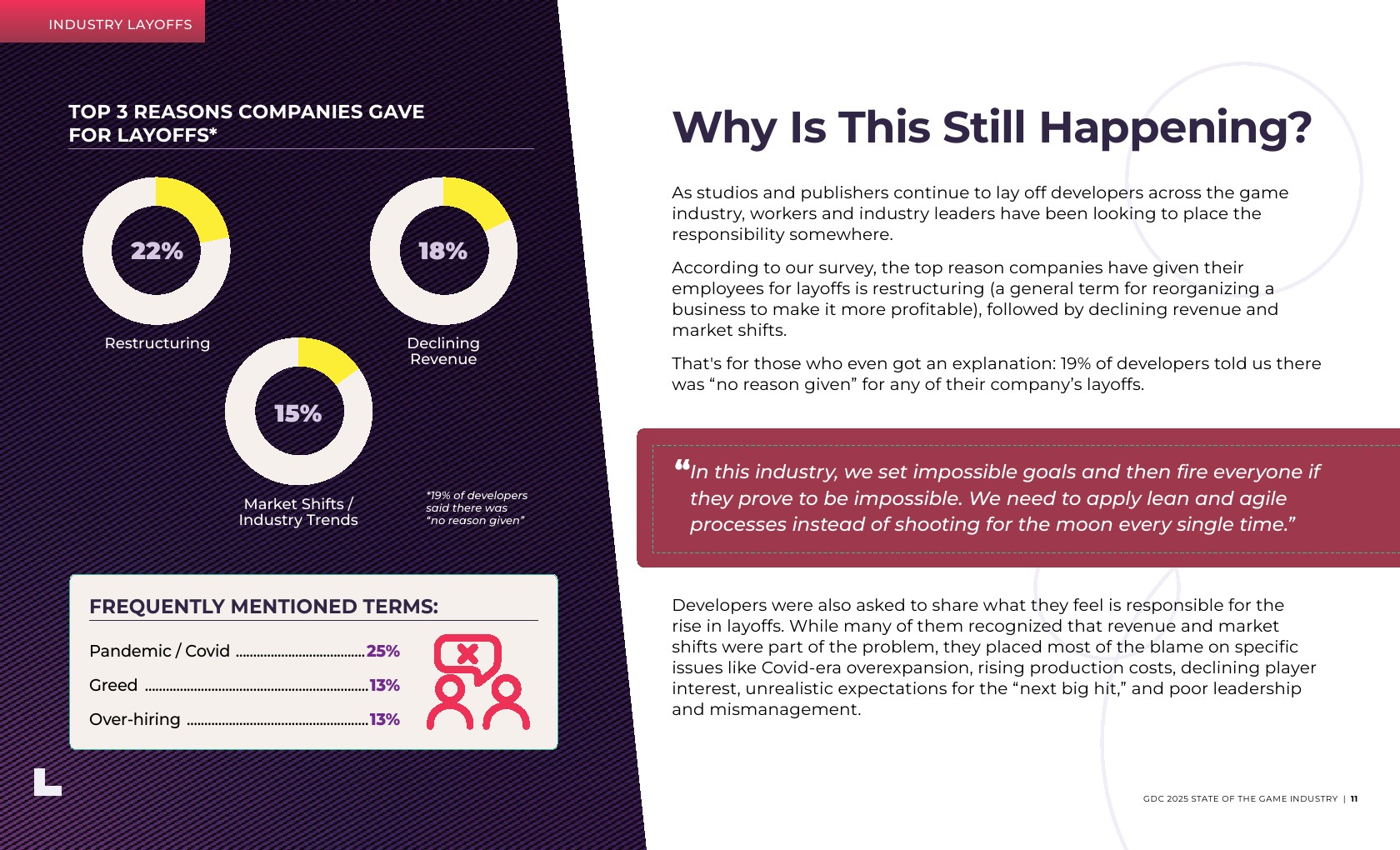 游戏叙事职位的年增长最为显著,从2024年的14%增长到现在的17%。游戏叙事专业人士报告称,他们在过去一年中受到了裁员的严重影响。