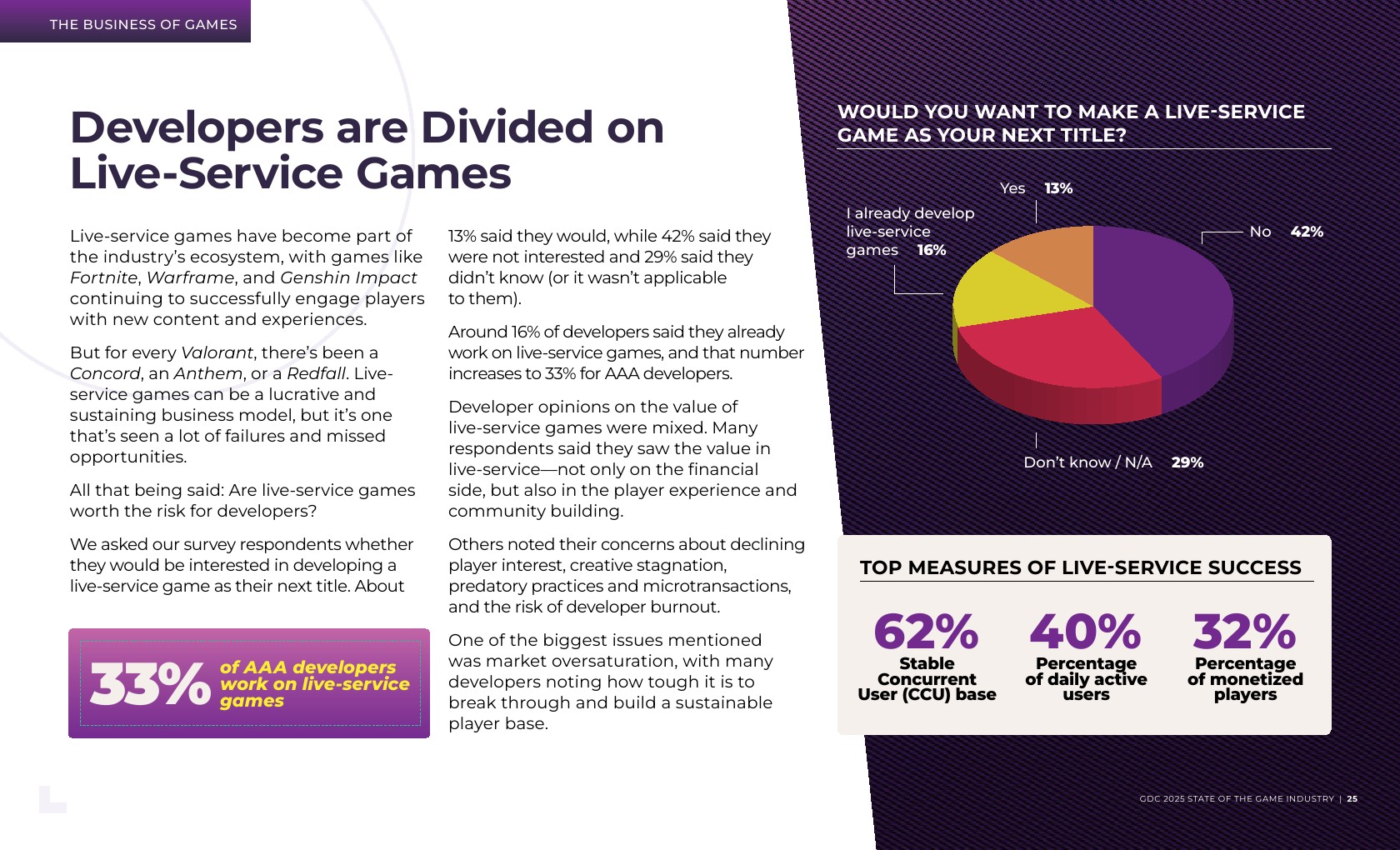 尽管裁员潮汹涌,游戏行业中的职位角色分布仍然保持一致。与2024年一样,最主要的角色是游戏设计、编程以及制作和团队管理。