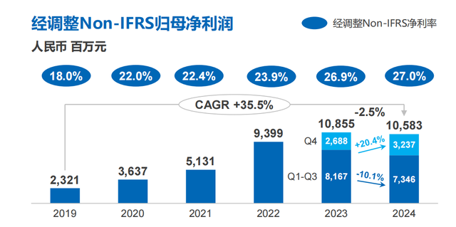 2024全年收入达到392.4亿,同比-2.7%,剔除2023年新冠商业化项目后同比+5.2%;经调整的Non-IFRS净利润是105.8亿,同比-2.5%。经调整的Non-IFRS净利润率同步稳步提升0.1个百分点,达到27%,达到了历史新高。