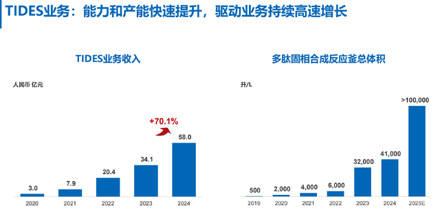 说完小分子D&M,再看看药明在手订单的另一贡献大户——TIDES,这个“TIDES”是“寡核苷酸”和“多肽”两类生物大分子的组合缩写,在药明当下的业务中,基本就是以GLP-1减肥药为代表的多肽类药物。2024全年,药明的TIDES实现营收58亿,同比增长70.1%,在手订单增速更是超过100%。公司给予这块业务2025年的增长指引是60%,按照这个指引,今年TIDES业务为公司贡献的营收就会超过90亿逼近100亿。
