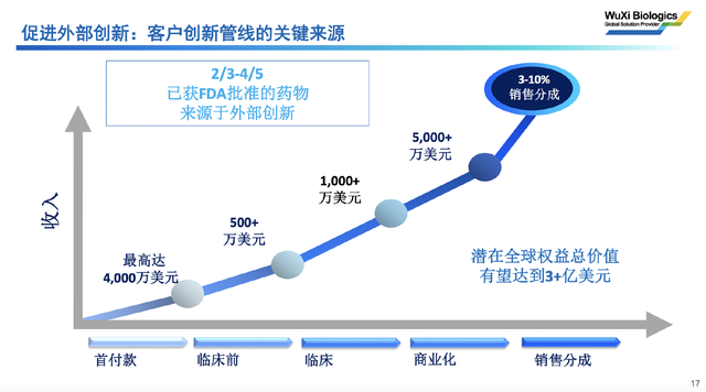 药明康德目前披露的这方面数据较少,药明生物披露较多,药明生物在JPM大会上披露其管线中能够收取里程碑付款&销售提成的项目有50多个。药明生物甚至直接认为未来驱动营收的最核心驱动力应当就是来自客户药物的销售分成。