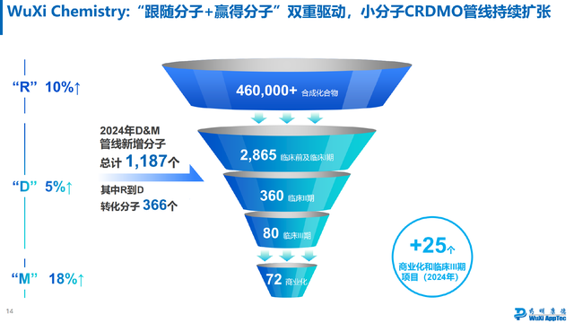 这里先讲小分子D&M以及后期项目情况。2024全年,药明的小分子D&M管线新增分子1187个,其中,由最前端R端转换到D端的就有366个,占整个D&M端新增项目的30.8%。能为企业带来更多营收和利润的是靠后一些的管线,似临床二期、临床三期乃至商业化阶段,从药明自己内部漏斗漏下去的远远高于从外部获取的。