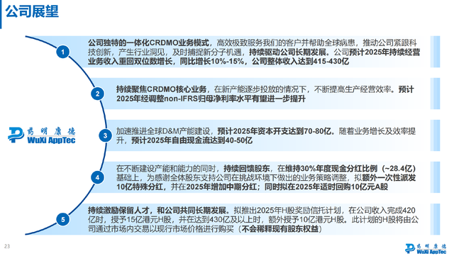 最后提一下公司对2025年的展望,营收增长10%-15%,经调整non-IFRS归母净利率有望进一步提升,也就是今年的净利润增速应该能达到20%以上。资本开支相比2024年翻一倍的情况下,自由现金流还能达到40-50亿,说明药明已经彻底实现自我造血了,所以药明在这次的年报里给了投资者两份大礼包。