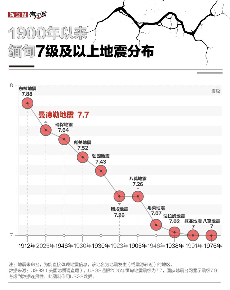 虽然国际上不同机构对缅甸此次地震的测量结果有所差异(我国地震台网显示7.9级、USGS检测7.7级),但都是一次7级以上的大地震。