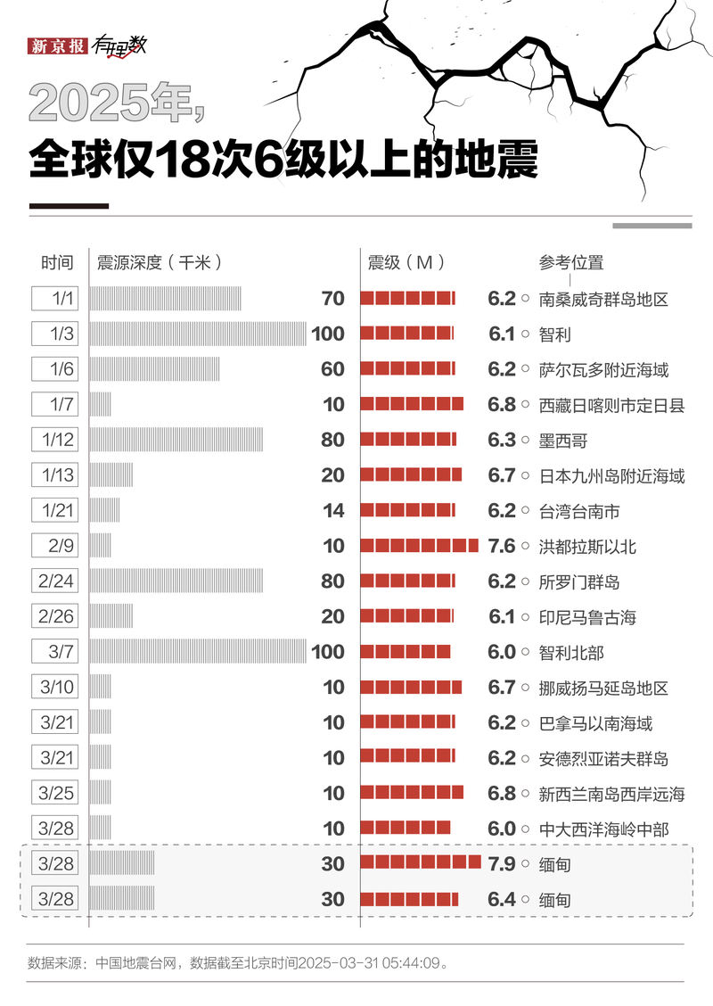 同时,此次缅甸地震也是今年以来全球最大震级地震,接着发生的6.4级强余震则是第18次6级及以上地震。